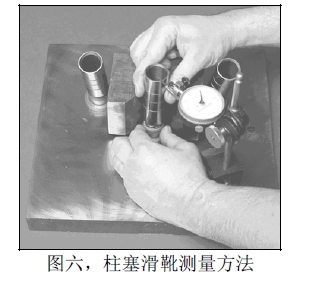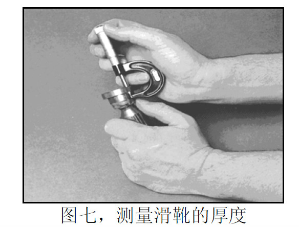 滑靴底的厚度是組成回轉體總的軸向尺寸鏈的參數之一,其尺寸的變換會改變軸向預緊力,導致液壓泵低壓情況下,可能會產生相應的磨損。測量方法見圖。全套柱塞滑靴厚度的最大點和最小點的差值不得大于0.05 mm (0.002 inch)