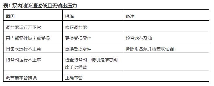 1. 泵內油流速過低且無輸出壓力故障排除見下表